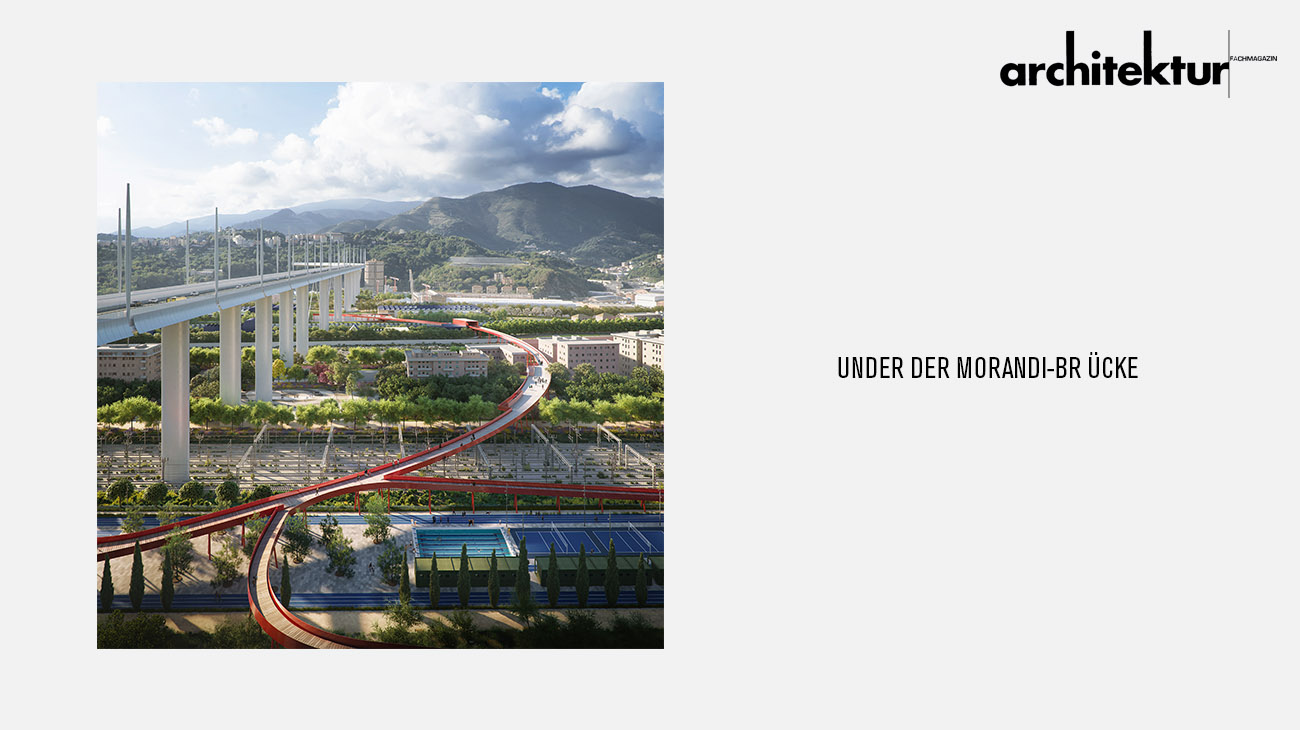 On Architektur Fachmagazin an article that shows the project of the Polcevera Park and the Red Circle designed by Stefano Boeri Architetti in collaboration with Metrogramma and Inside Outside, with the aim of restoring value to the area below the new Renzo Piano bridge, under construction in replacement of the infamous Morandi Bridge. The architectural and landscape intervention involves the preservation of a system of green areas – capable of accommodating numerous essences typical of the Mediterranean scrub and multiplying their biodiversity – and the creation of a large steel Red Circle – a cycle-pedestrian path with different heights – connecting the two sides of the valley.
