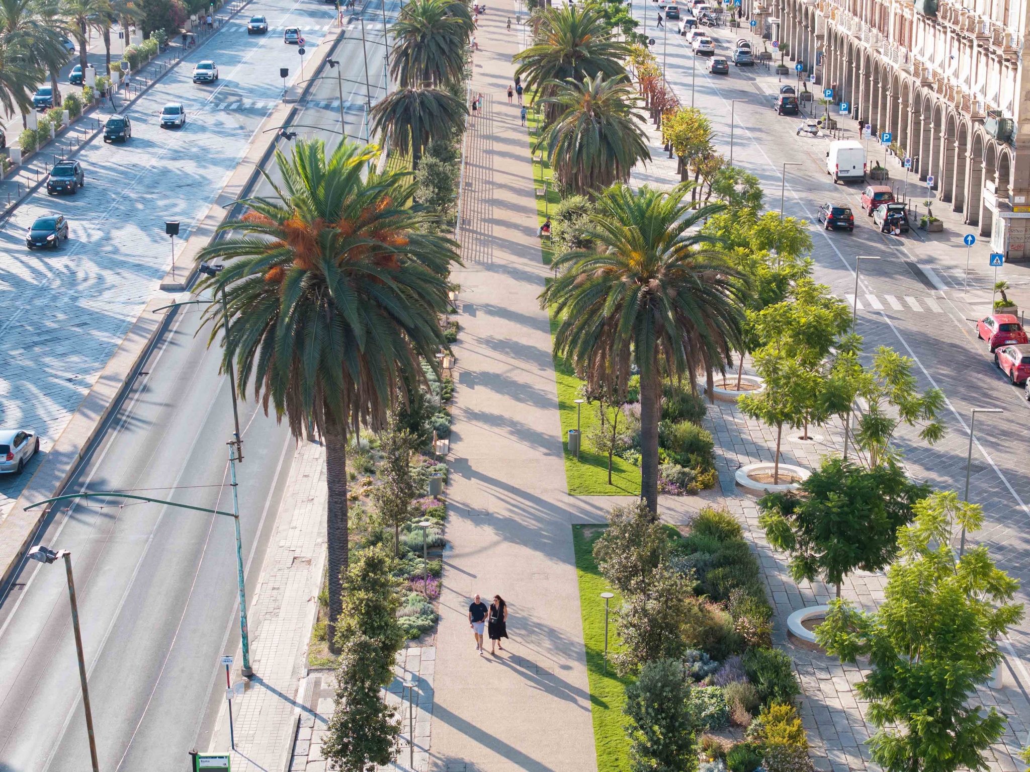 The new urban and landscape intervention restores the social and environmental value of Cagliari’s seafront by means of a green promenade that recaptures the original 19th-century function of Via Roma. Starting from the Cagliari tradition of tree-lined avenues, the project defines a continuous, pedestrian and shaded public space that functions as a ‘green lung’ and connector element, both longitudinally between the FFSS station and Piazza Ingrao, and transversely – between the city and the sea.