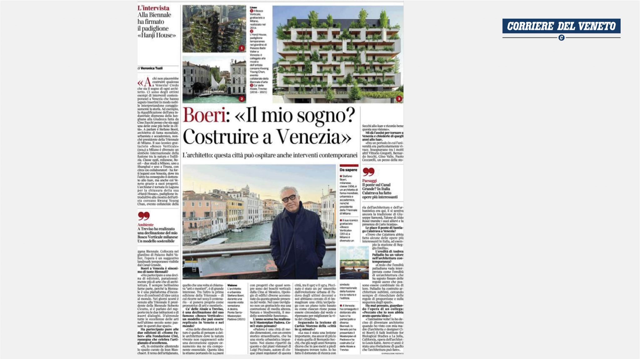 L’articolo si concentra sui progetti passati e le visioni future ideate dallo studio Stefano Boeri Architetti in Veneto, citando sia edifici costruiti, come Ca’ delle Alzaie a Treviso, sia visioni più a larga scala, come il Piano degli Interventi di Padova.