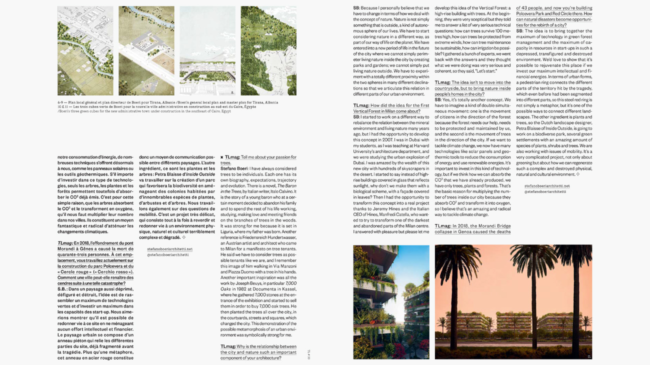 Su TLmag – rivista culturale belga e bilingue, pubblicata interamente francese e inglese – un’intervista a Stefano Boeri che racconta la nascita dell’idea di Bosco Verticale ispirata dalla lettura del Barone Rampante di Italo Calvino, dal manifesto di Friedensreich Hundertwasser, artista e architetto austriaco, e dal lavoro di Joseph Beuys del 1982 per Documenta a Kassel chiamato 7000 Oaks, dove raccolse 7000 pietre all’inizio della mostra e iniziò a venderle per acquistare 7000 querce, poi messe a dimora in tutta la città, nei cortili, nelle strade e nelle piazze.