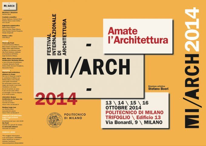- Festival internazionale di architettura promosso dal Politecnico di Milano, di cui è direttore artistico Stefano Boeri.MI/ARCH per quattro giorni ospiterà incontri, lezioni, dibattiti, proiezioni nello spazio sorprendente del Trifoglio, l’architettura progettata nel 1961 da Gio Ponti all’interno del Campus Leonardo del Politecnico di Milano.MI/ARCH ospiterà lezioni di grandi protagonisti dell’architettura del pianeta come Liz Diller/Diller&Scofidio (progettisti dell’High Line di New York), Winy Maas/MVRVD (autori, tra le altre opere, del Mirador di Madrid), il paesaggista francese Gilles Clément (inventore del Giardino Planetario) che aprirà MI/ARCH la sera del 13 ottobre, Dominique Perrault (autore, tra le altre opere, della Grande Biblioteque di Parigi), Beatriz Colomina (studiosa, docente a Princeton, premiata dalla Biennale 2014),Patricia Urquiola (designer spagnola divenuta celebre in Italia) e Arata Isozaki, uno dei decani dell’architettura giapponese, che chiuderà MI/ARCH con un evento speciale fuori-programma il 29 ottobre.Grazie a nomi come Andrea Branzi, Baukuh, Antonio Citterio, Mario Cucinella, Michele De Lucchi, Cherubino Gambardella, Vittorio Gregotti, Piero Lissoni, Fabio Novembre, Italo Rota, Cino Zucchi, a MI/ARCH saranno rappresentate le diverse generazioni e correnti di pensiero dell’architettura e del design italiano.MI/ARCH sarà anche la tribuna per una nuova generazione di architetti e studiosi internazionali: un ciclo vedrà succedersi i belgi Architecten De Vylder Vinck Taillieu, i greci Point Supreme, i tedeschi FAR ed il gruppo Failed Architecture. Inoltre, MI/ARCH ospiterà un dibattito, a cura del collettivo Material Contexts, con Adam Lowe dello studio Factum Arte.A MI/ARCH saranno infatti protagoniste, con un loro spazio, le riviste e le Scuole di Architettura e di Design di Milano. Oltre ad Architettura e Società, Architettura Civile, Design, Ingegneria Edile/Architettura del Politecnico di Milano, a MI/ARCH parteciperanno altre Scuole come Domus Academy e NABA, IED e la Scuola Politecnica di Design, che presenteranno al Trifoglio ricerche, progetti, idee e programmi di studio.