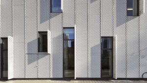 All’esterno il rivestimento metallico è scandito in verticale dai giunti dei pannelli e dalle lunghe aperture munite di una struttura frangisole delle stesse dimensioni, perpendicolare alla parete, che crea inediti giochi di luce. L’edificio si apre verso la città circostante, contraddicendo la sua forma compatta e introversa attraverso vari accorgimenti formali, tra cui le evidenti e massicce sporgenze delle pensiline sui lati sud ed est e la grande vetrata a tutta altezza a nord, che si offre come una vetrina sulla città delle attività organizzate dal centro culturale. Una scalinata posta al di sotto della tettoia e affacciata verso il parco conduce a uno spazio semiaperto che funge da atrio del primo piano. L’alternarsi di pieni e vuoti innesca un interessante dualismo materico, che si risolve nel tentativo di alleggerire un corpo apparentemente massiccio e poco permeabile alla vista.