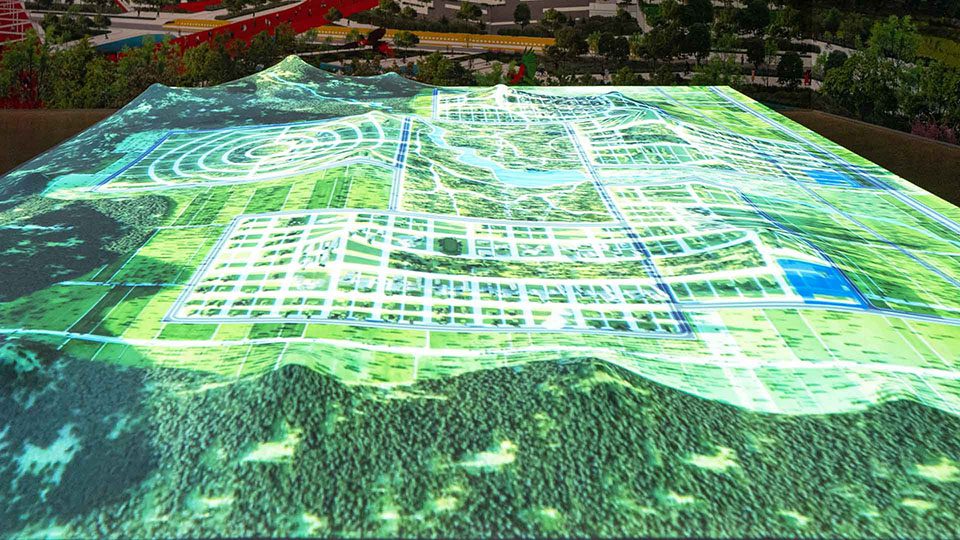 Al centro dell’allestimento un modello cinetico 3×3 m mostra tre possibili sviluppi di Forest City, in diversi territori. La morfologia naturale viene alterata dalla nascita della città, mettendo in relazione la mutazione artificiale con il paesaggio naturale: una morfologia in continuo mutamento. Trentasei punti cinetici permettono di narrare – come mostrato nel video – differenti realtà naturali, da situazioni montuose a desertiche, su cui sono proiettate le immagini dei possibili sviluppi delle Forest Cities.